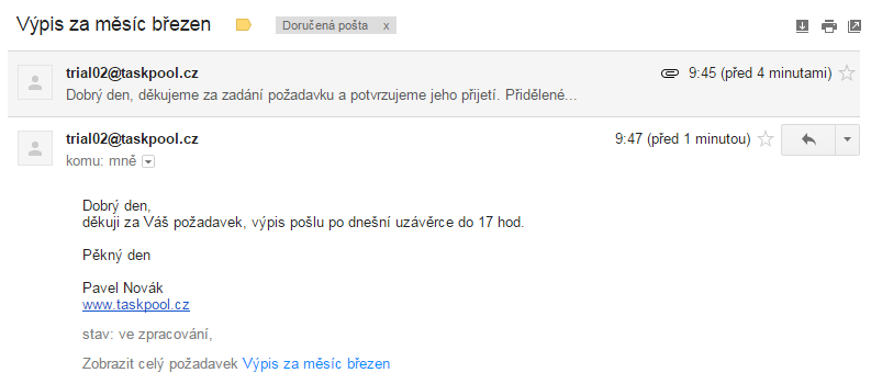 - odkaz na helpdesk, kde se nám chronologicky zobrazí vývoj celého požadavku od zadání až po archivaci.