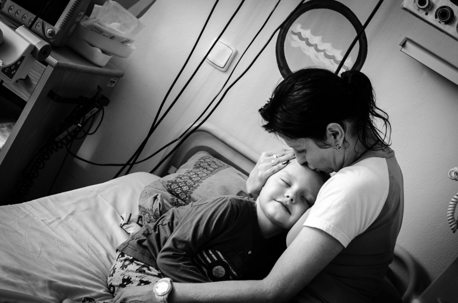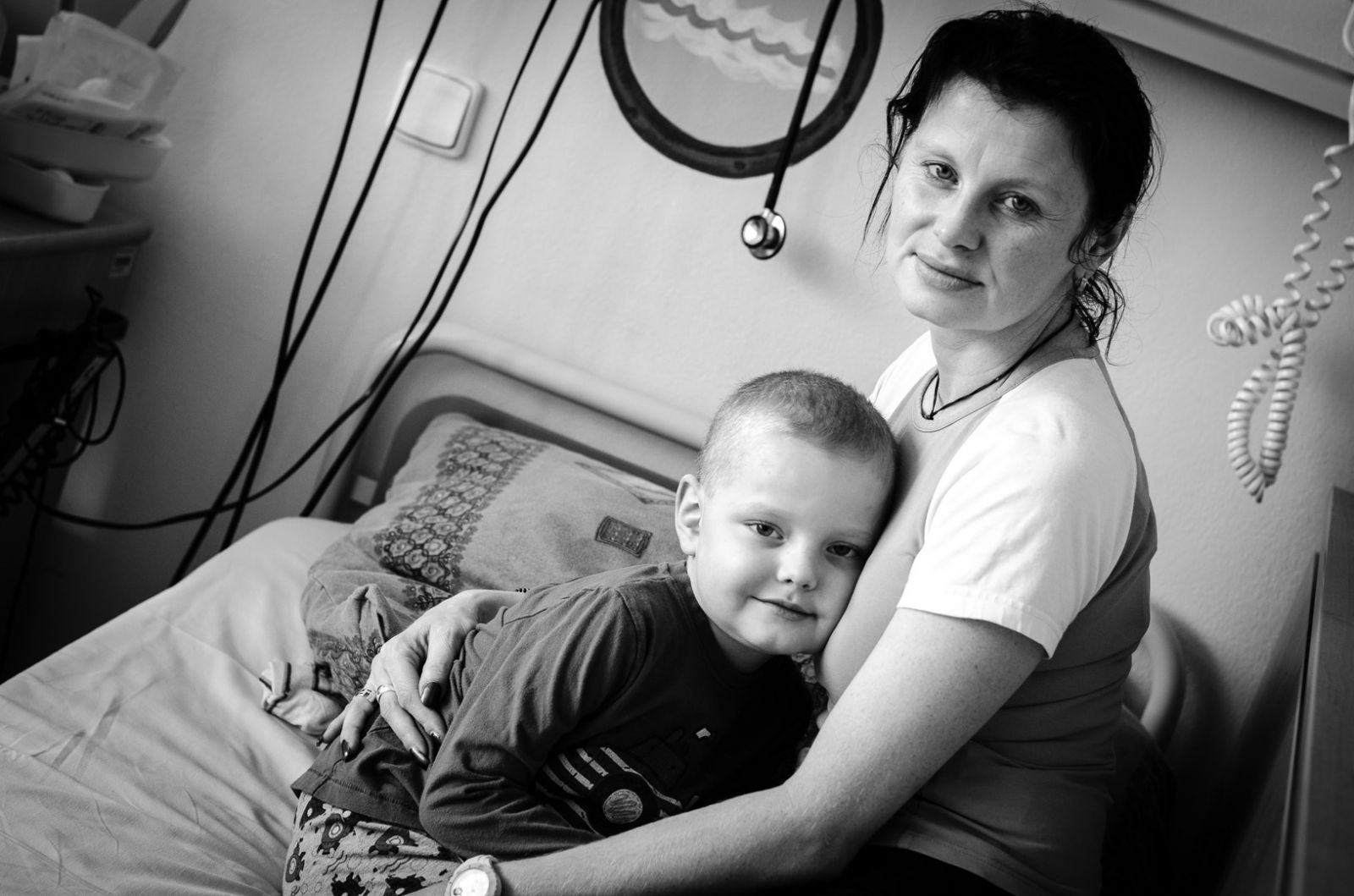 A tak se rodině ze dne na den změnil život. Paní Soňa začala chvíli předtím podnikat – pronajala si penzion u vleku a těšila se na jeho otevření. S Martínkovou diagnózou se vše změnilo, bylo jasné, že penzion musí přenechat konkurenci, protože ji její syn bude potřebovat. „Ze začátku léčby jsme byli ve Fakultní nemocnici v Olomouci velmi často, jen první měsíc jsme najezdili 4 000 km,“ vysvětluje paní Soňa a pak se zadívá na černobílou fotografii, kde je vyfocená se svým synem v nemocnici: „Tenkrát byl Martínek na začátku léčby, po druhé chemoterapii, nebylo mu dobře, objetí vždy pomohlo. U mámy byl v bezpečí.“